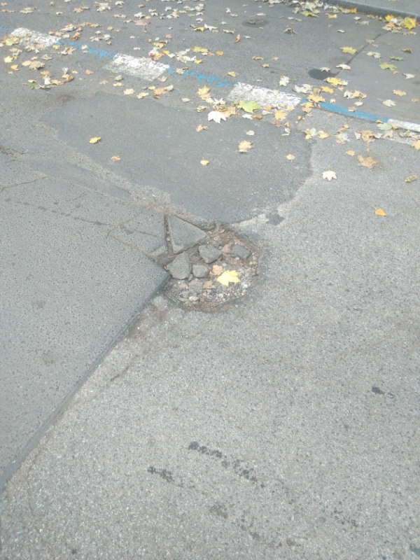 díra ve vozovce v ulici Fibichova za křižovatkou Pospíšilova z výjezdu z garáží pod Žižkovskou věží.