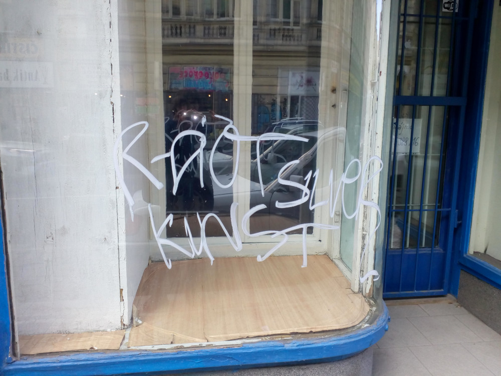 Grafiti na výloze domu HUsitská 76/27.