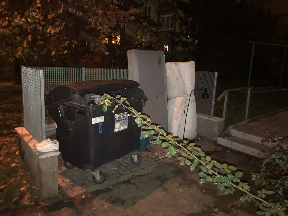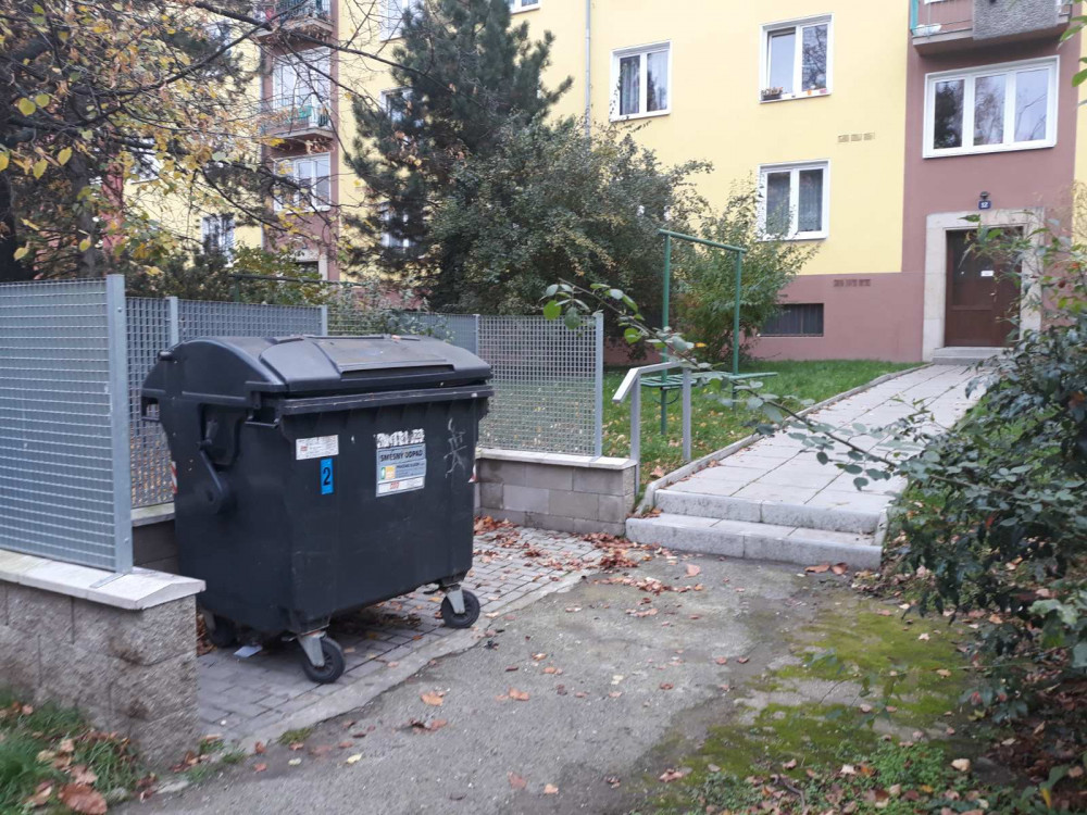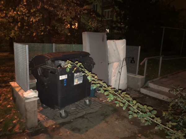 U popelnicového stání pro domy 2453 - 2455 na adrese Luční 2454/12 je odložena kostra gauče, matrace a další odpad