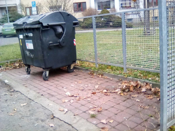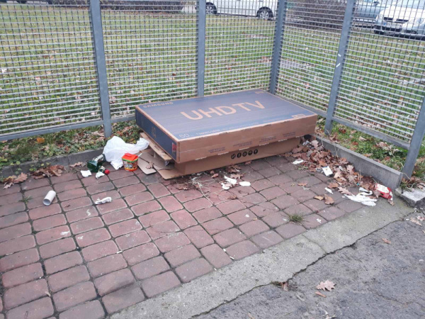 Neporadek u kontejneru,pohazene kartony K chmelnici 5