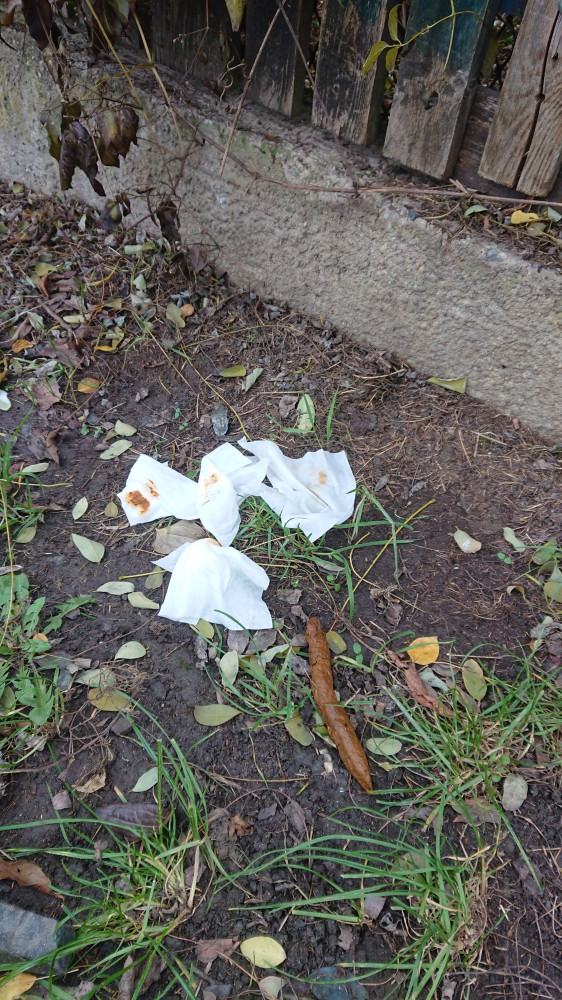 Lidské výkaly spolu s vlhcenymi ubrousky. Poloha na rohu skautského výběhu pro slepice.