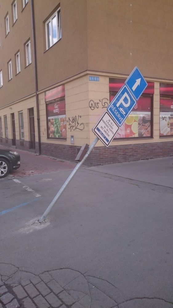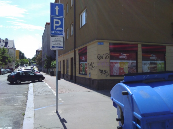 Temer pokacena znacka na rohu Konevovy a Strazni