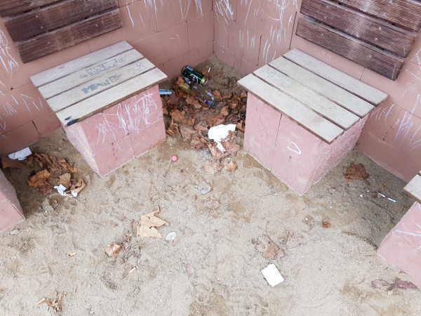 V pristresku na detskem hristi na nam. Jiriho z Lobkovic se nachazi lahve od alkoholu, nedopalky od cigaret a dalsi odpadky.
