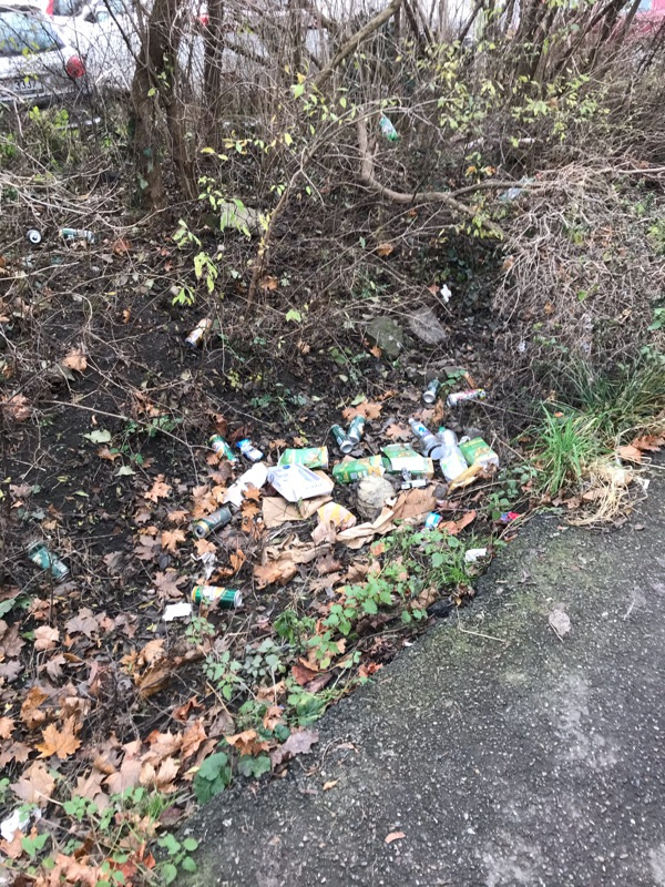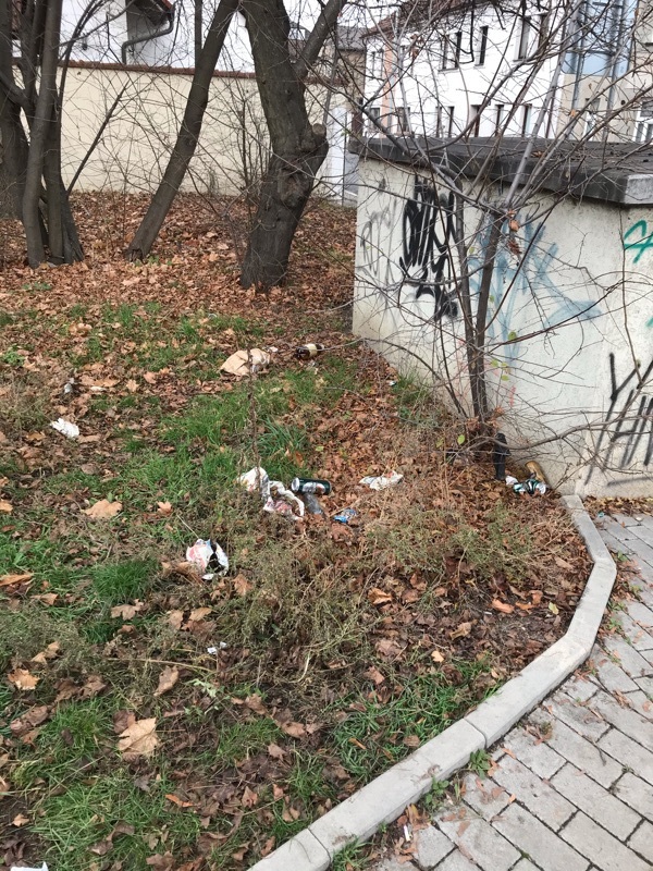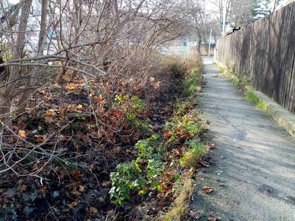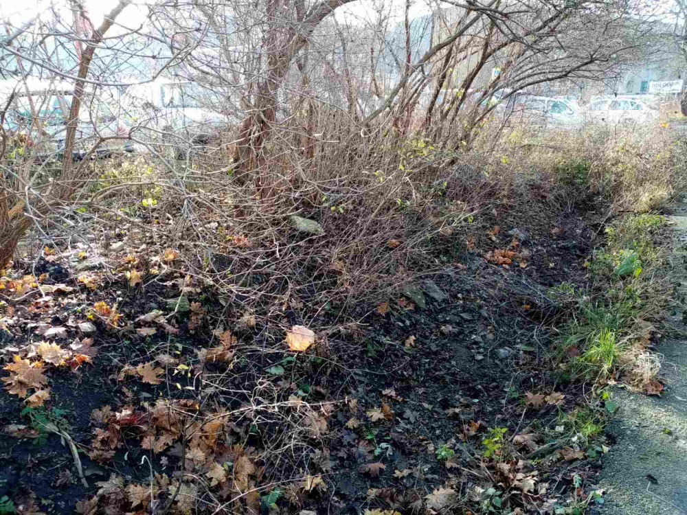 Pořád dokola - zarostlý příkop plný odpadků. Naproti vedle jídelny neshrabané listí, zaschlé stromky, odpadky .