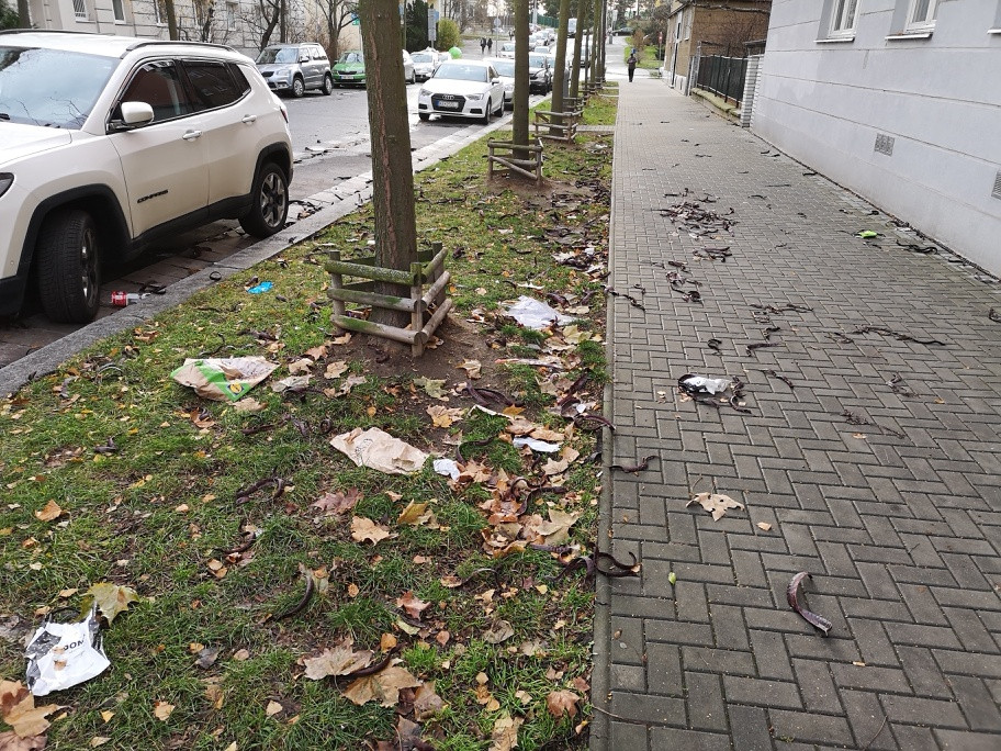 Ulice jeseniova - po cele délce az k urovni VS kokeji, pohazene odpadky, resp. Spis rozfoukane. Asi jeste zbytky z minuleho hlášení. Moc dekuji za minulou rychlou akci