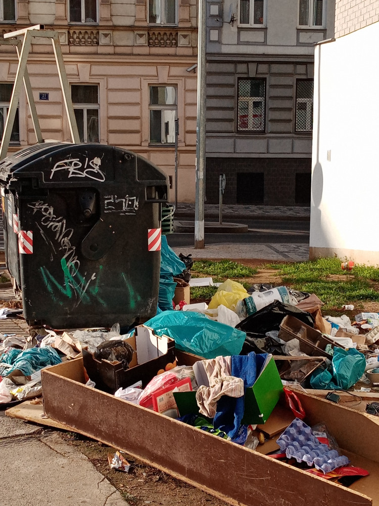 Pánové, prosím prověřte tento nepořádek. Je to svinčík SVJ, ale odpadky budou poletovat po okolí. Takže to pro tentokrát ukliďte.