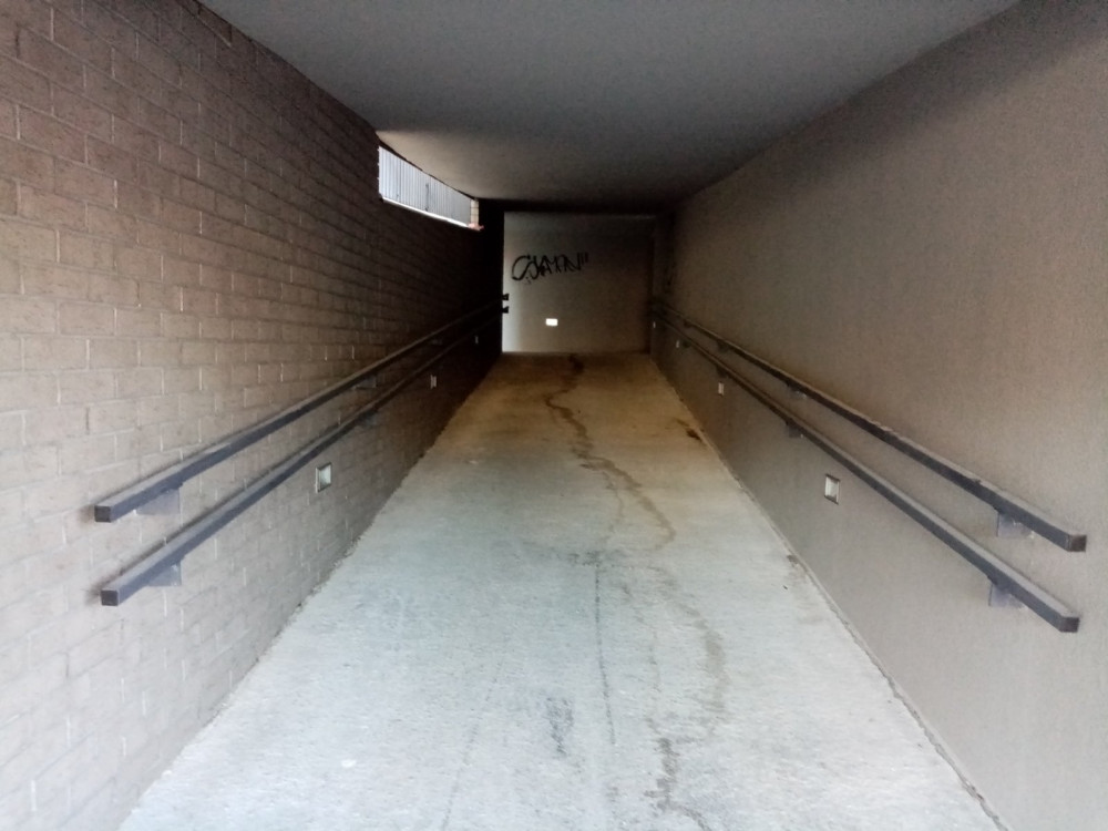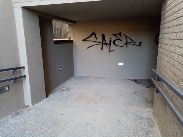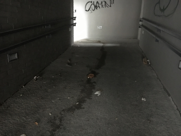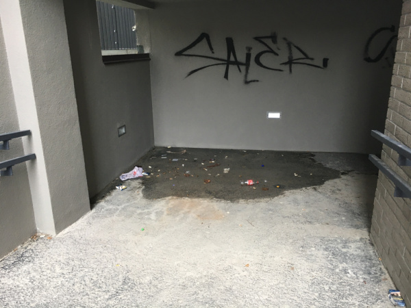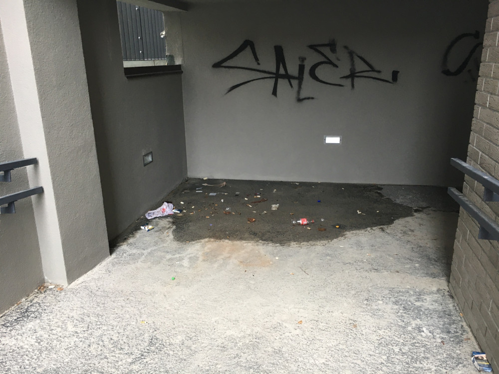 Znečištěný průchod mezi domy Roháčova 46 a 44, od znovuotevření se vůbec neuklízí.