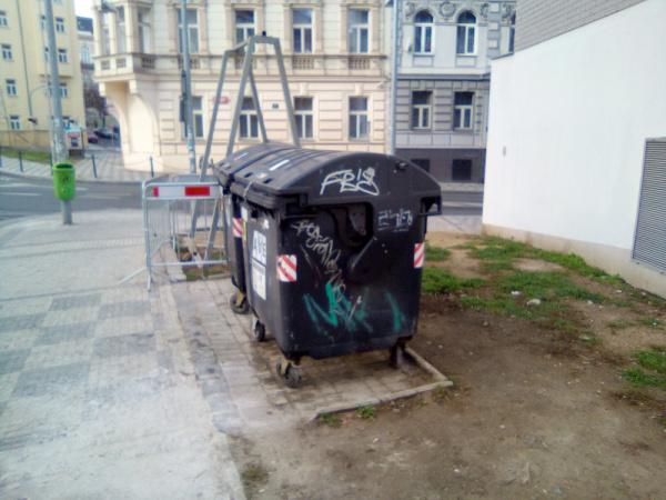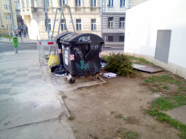 Neporadek kolem popelnic. Rokycanova - Jeseniova.