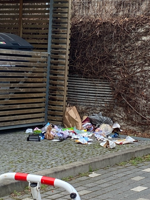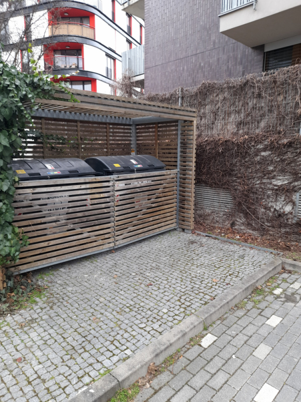 Nepořádek kolem popelnic na komunální odpad na rohu ulic Olgy Havlové a Rixdorfska