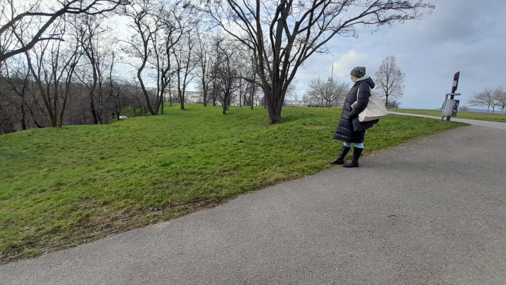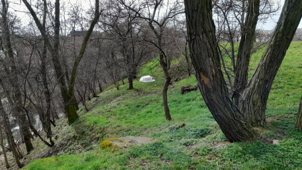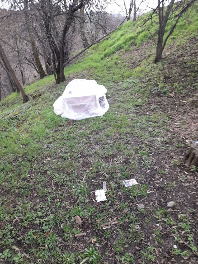 Vrch sv. Kříže - lezeni bezdomovce. Prosím odstranit