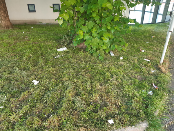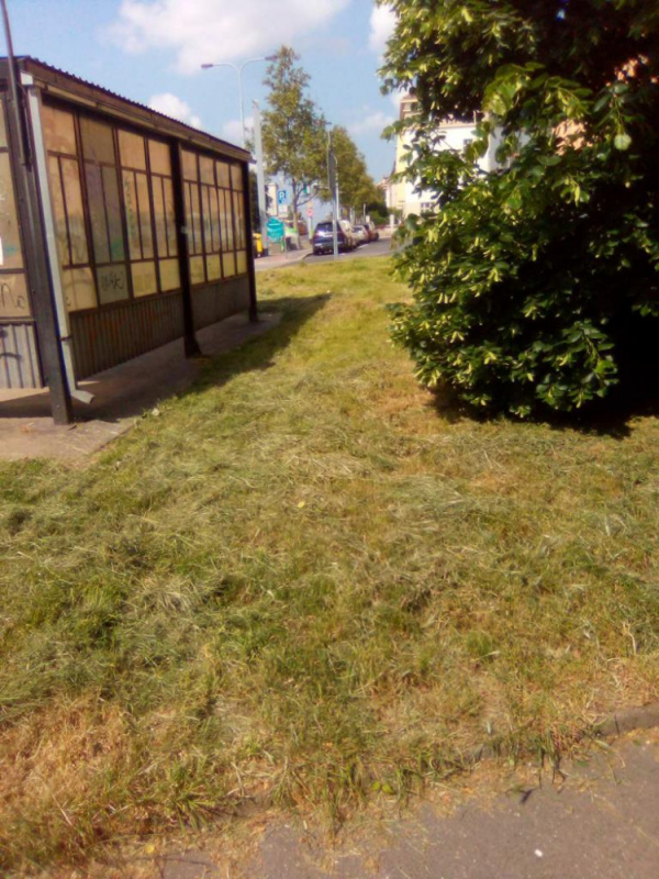 Odpadky a oblečení rozeseté po posekane trávě u zastávky Chmelnice