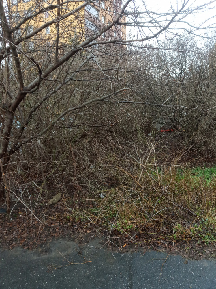 Ostříhané pohozené větve. Nepodarek v křoví.