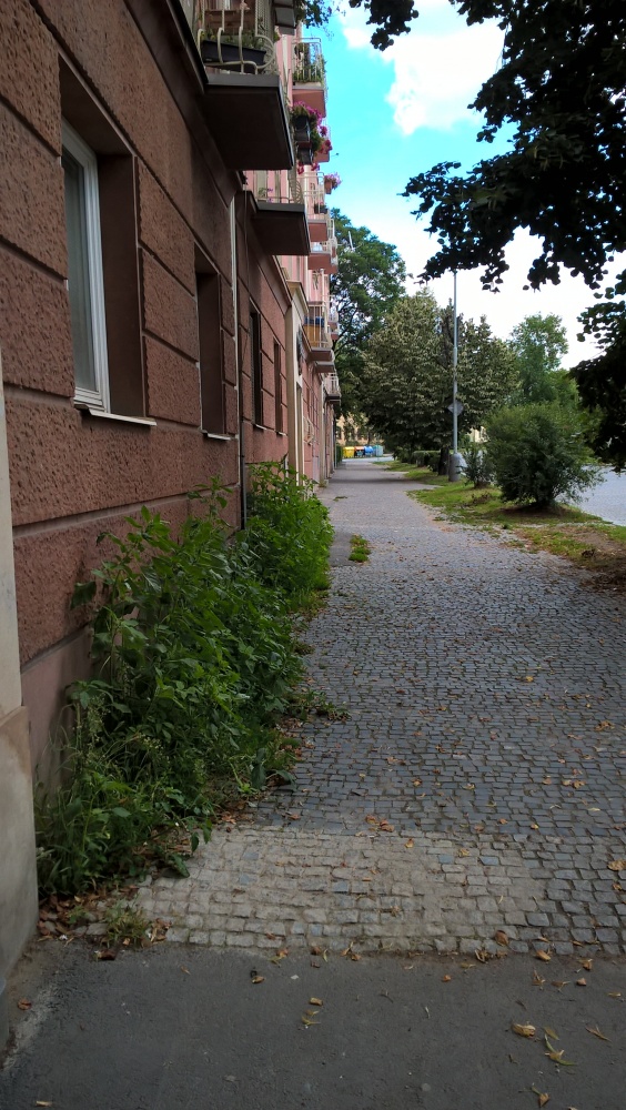 Chodník v Malešické ulici je ve špatném stavu (nerovnosti apod.) a zarůstá rostlinami. Přikládám fotku z blízkosti zastávku MHD Basilejské náměstí (směr Florenc).