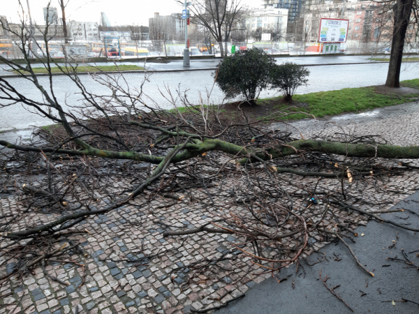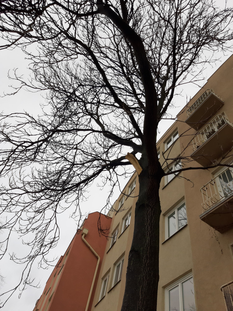 V důsledku silného větru se zlomila velká větev a spadla na chodník před domem v Malešické ul. 31. Také by bylo vhodné strom odborně ošetřit.