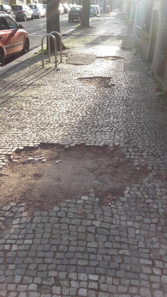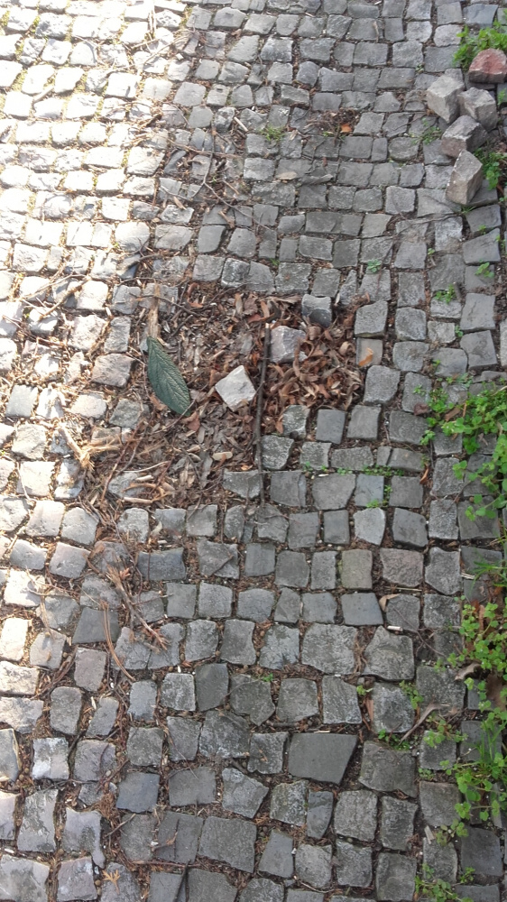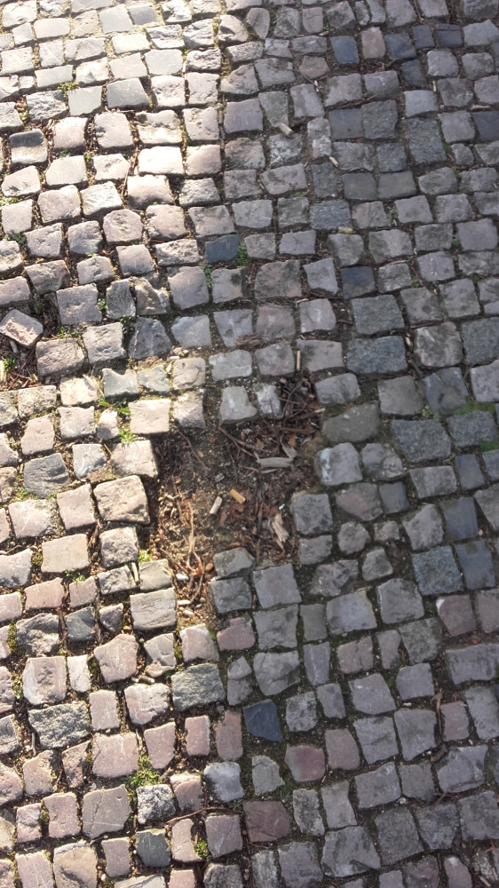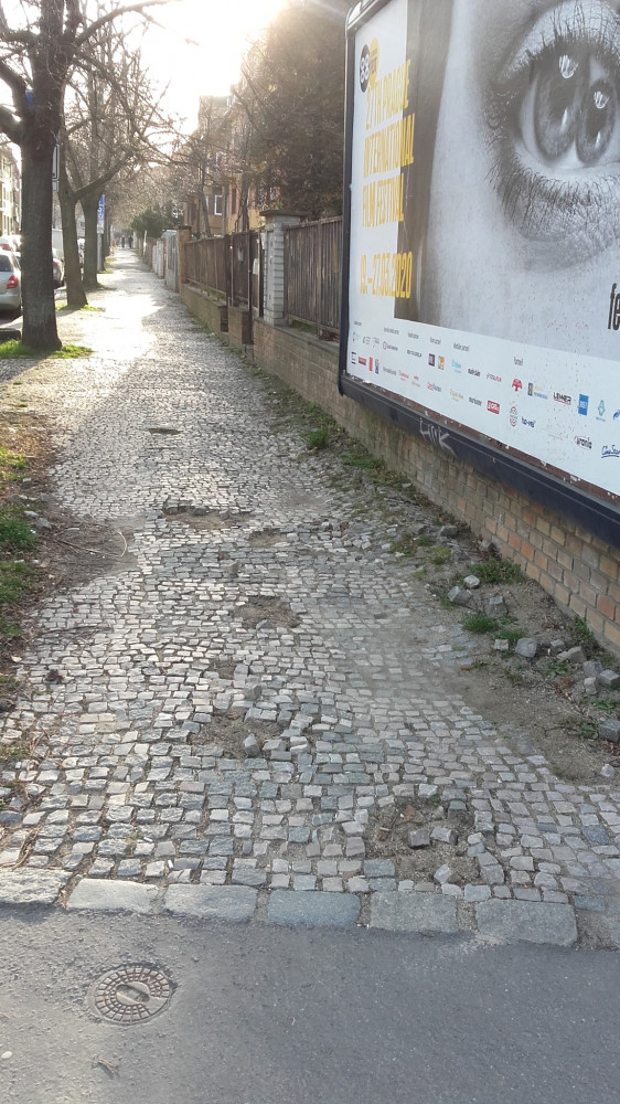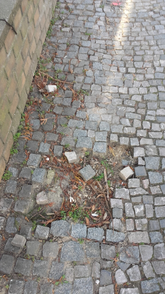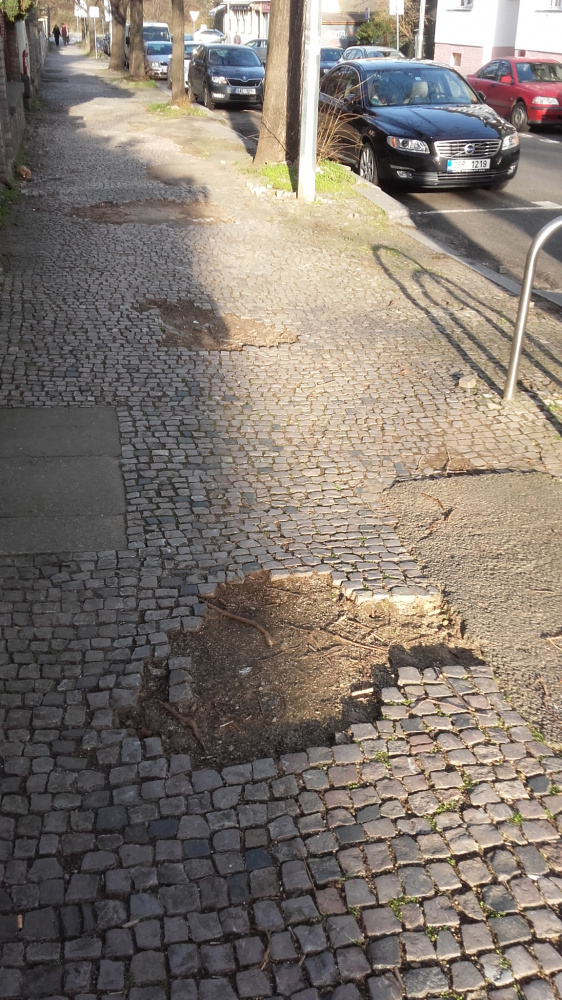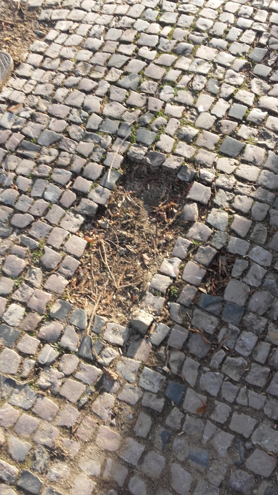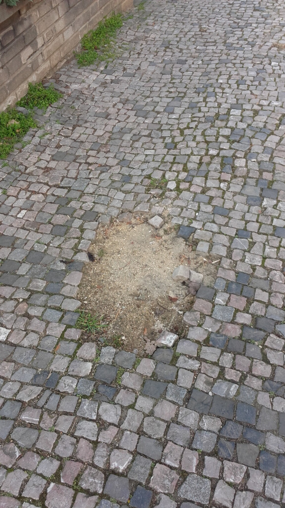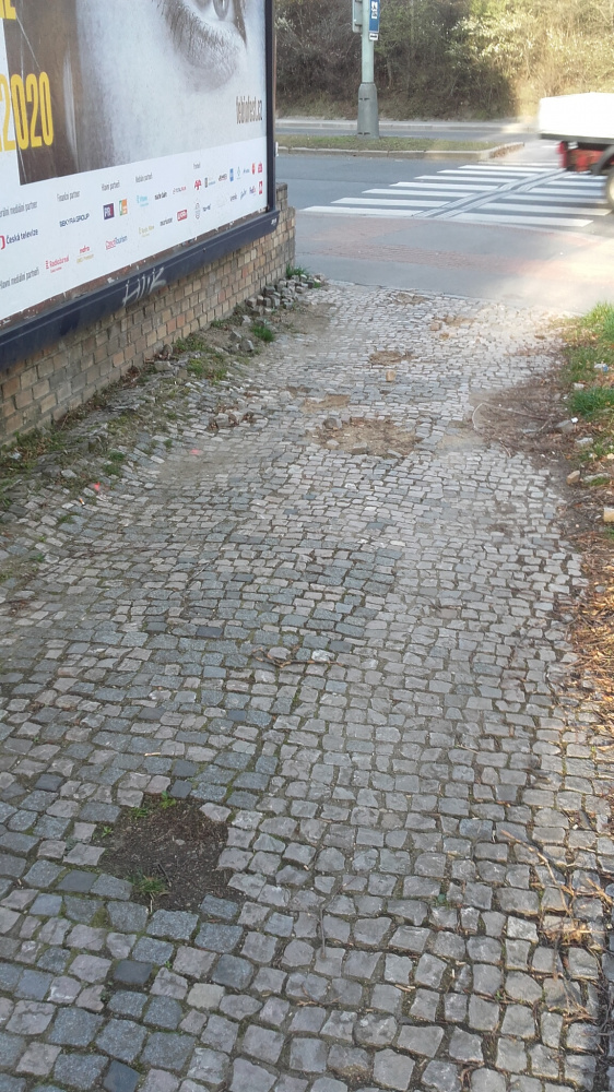 Foto v příloze - vzniklé díry v dlažbě je vhodné zadláždit co nejdříve, protože se neustále uvolňují další dlažební kostky a díry se tak zvětšují. Za tmy hrozí zvrtnutí kotníku jak v díře, tak šlápnutím na uvolněné či vypadlé kostky, které se povalují v okolí děr.
