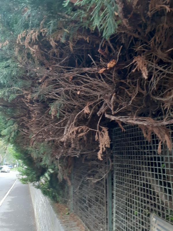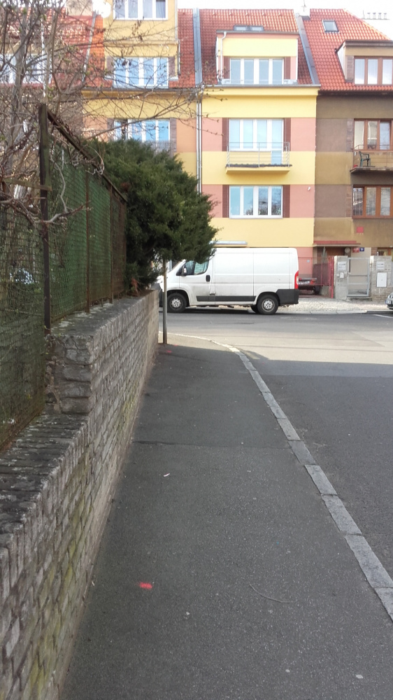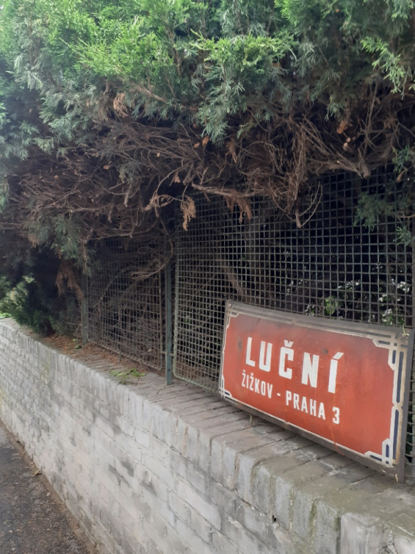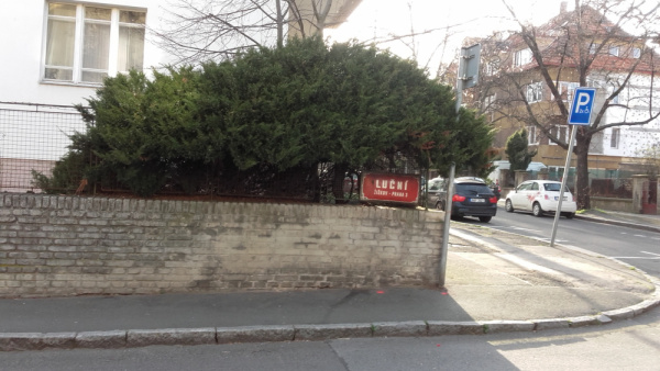 Křoví prorůstá plotem ze zahrady na chodník a brání v pohodlném průchodu, někdy nutí chodce až ke vstoupení do vozovky. Je potřeba ořezat větve vyčnívající na chodník. Jde o úsek na křižovatce ulice Luční a U Kněžské louky vlevo ve směru jízdy z ulice Luční, hlavně v ulici Luční, ale též v ulici U Kněžské louky 30.