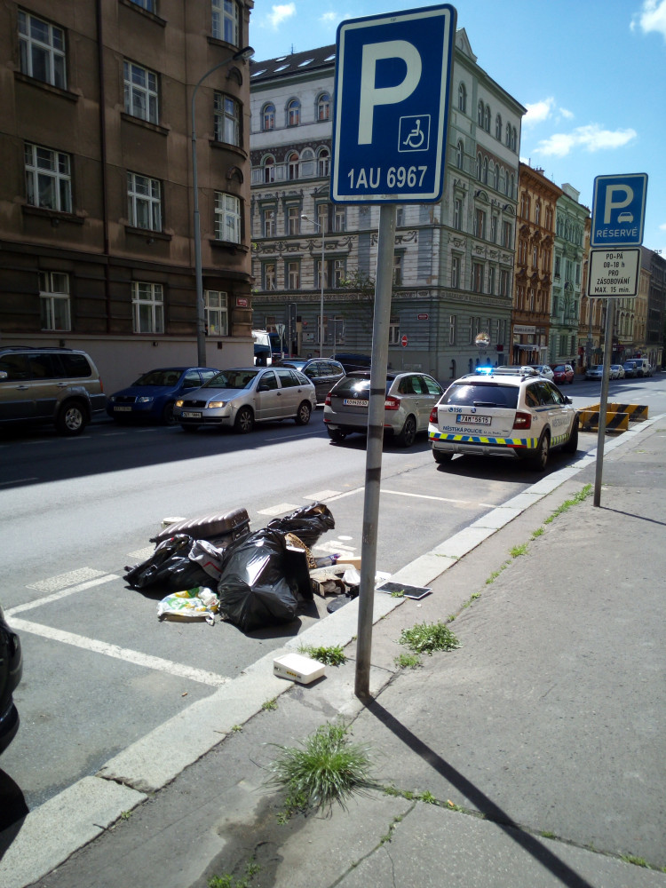 Hromada odpadu na vozovce u chodníku.(Kufr,igelitové pytle,monitory,oblečení).