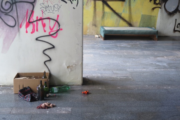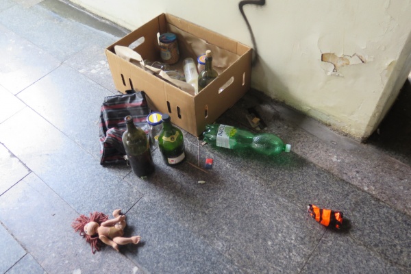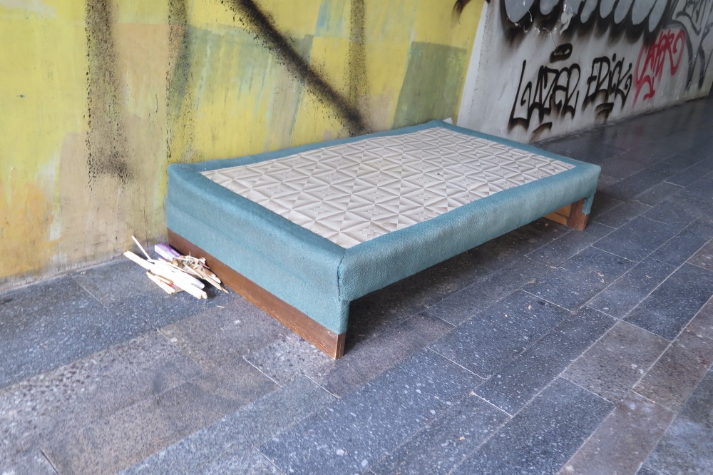 V podloubí u Bezovky si někdo zřídil noclehárnu.