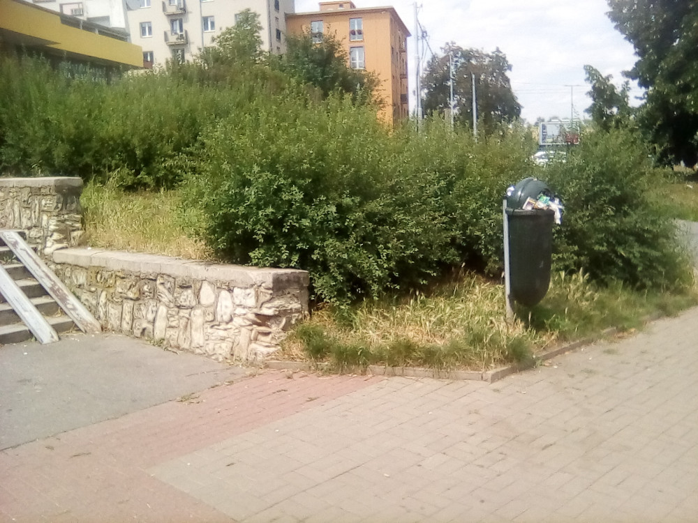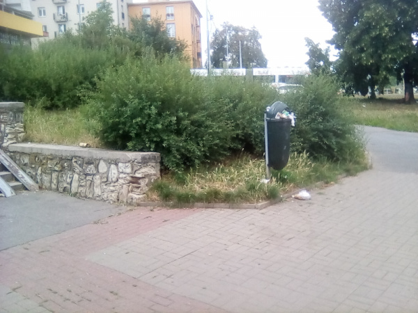Nepořádek u koše a v okolí.