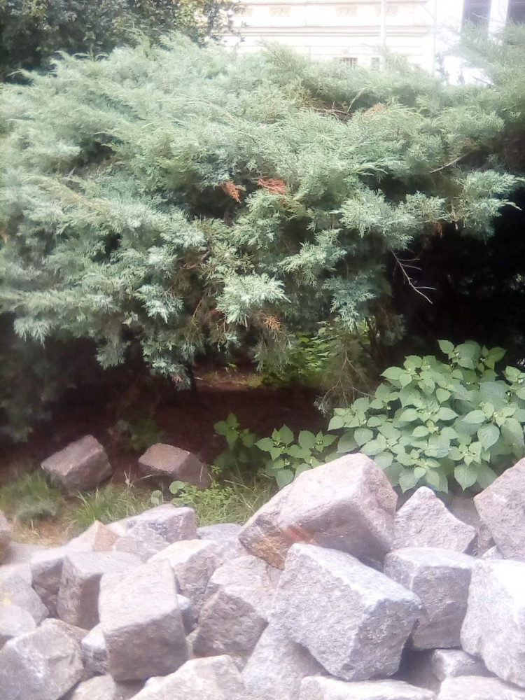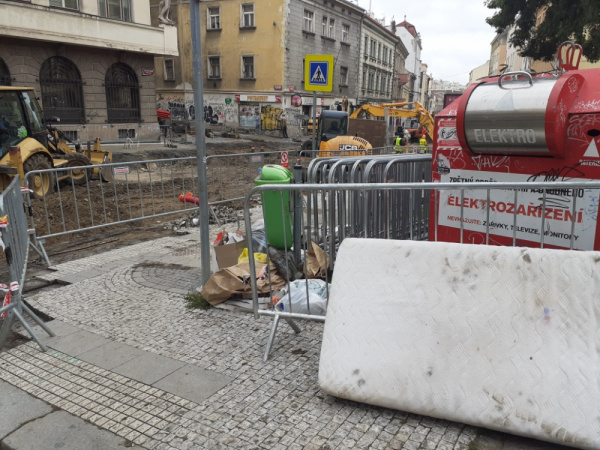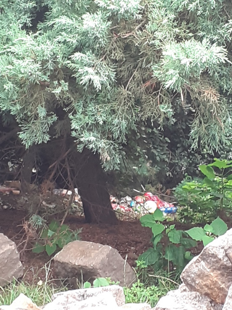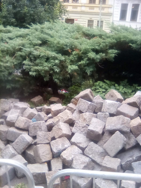 děkujeme za Váš podnět. Na uvedeném místě jsme uklidili. Nepořádek pod keři je nedostupný. Lze realizovat po ostříhání keřů a ukončení stavby.