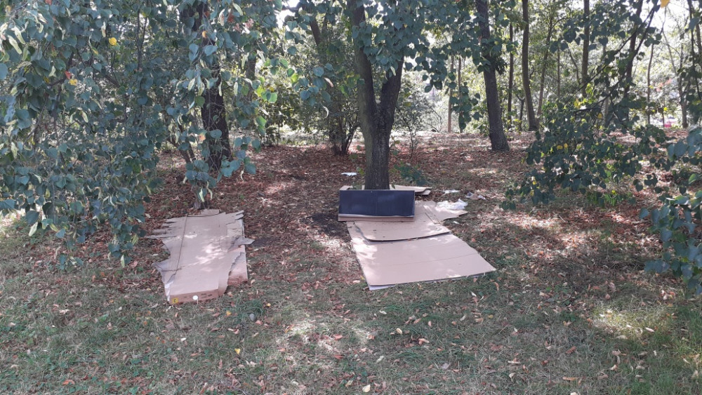 ložnice bezdomovců n Pecich . Kousek od vstupu na Pece z Jilmova x Strážní. Na hraně palouku proti plotu MŠ.