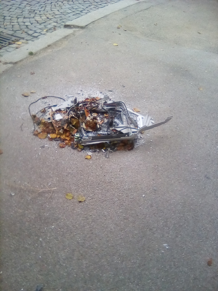 Rozbitý monitor na chodníku na rohu Malešické 21 a Basilejského naměstí.
