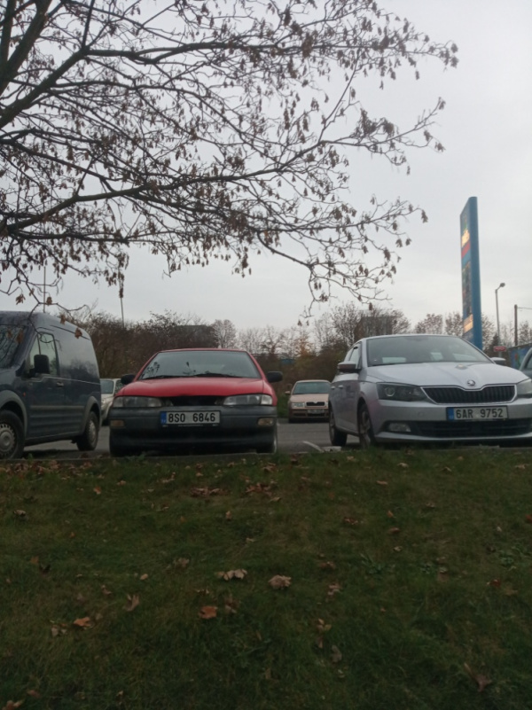 Autovrak. Jedná se o prostřední auto. Parkoviště u čerpací stanice.