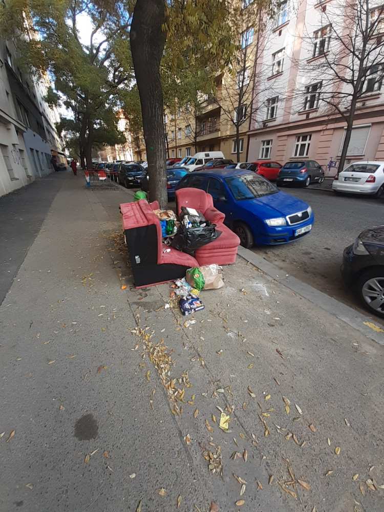 Nábytek a odpadky na chodníku. Biskupcova ul.