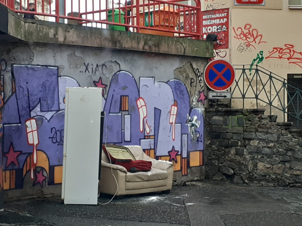Lednice a sedací souprava na rohu Chlumovy ulice...