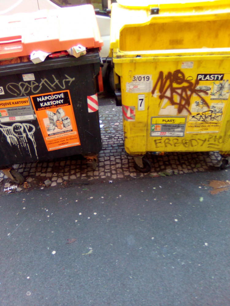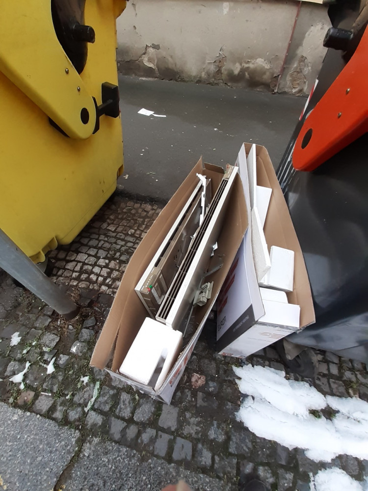 Něco elektrického, asi k počítači, na stanovišti tříděného odpadu.