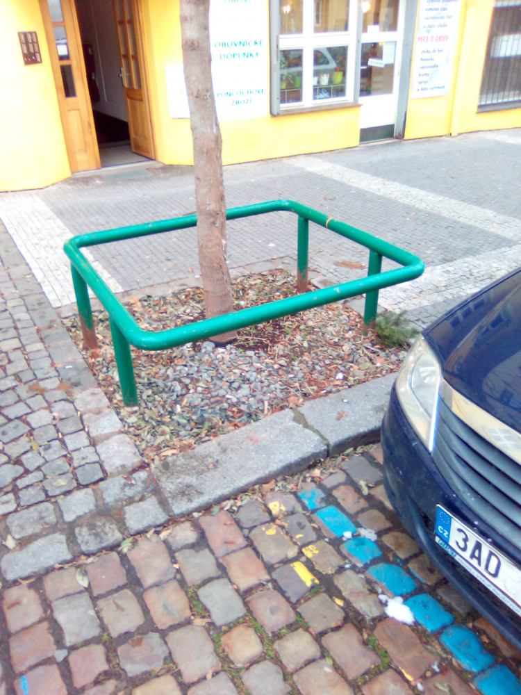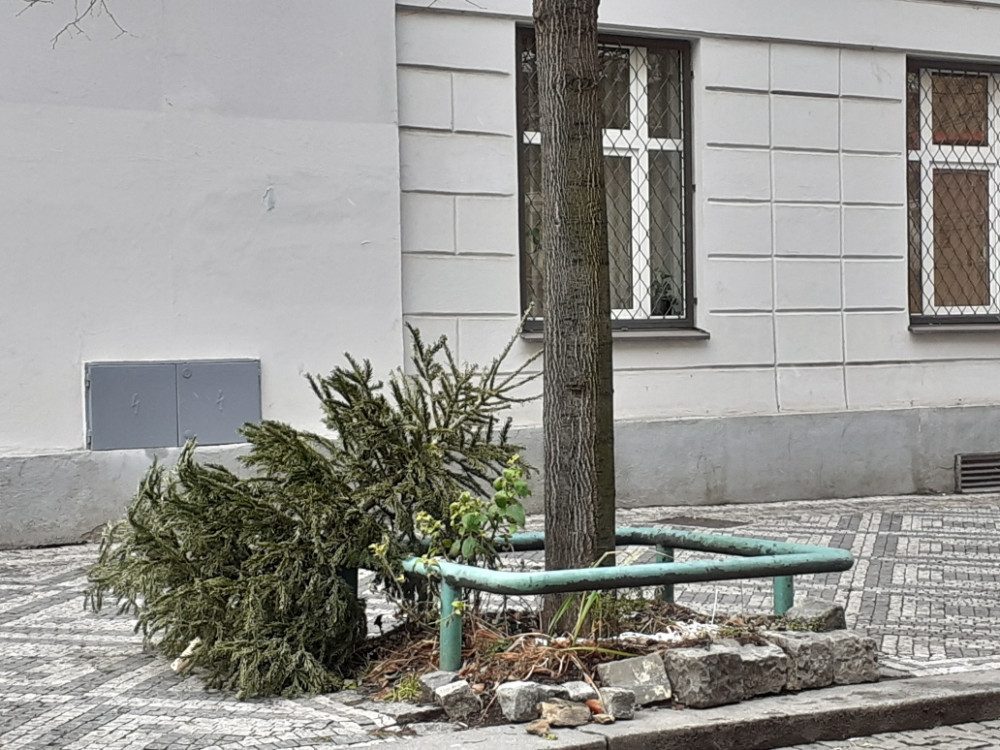 Vánoční stromky v rabátkách. Jeden je na kříž. Z.Hajského a Roháčova, druhý je přes křižovatku na dohled a další torzo je u odpadkového koše v ulici Roháčova, o křižovatku dále...