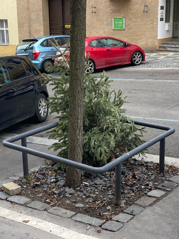 V ulici Sudomerska (v casti pod Lucemburskou) jsou u nekolika stromu odlozeny vanocni stromky.