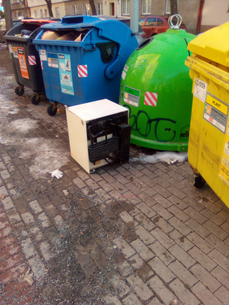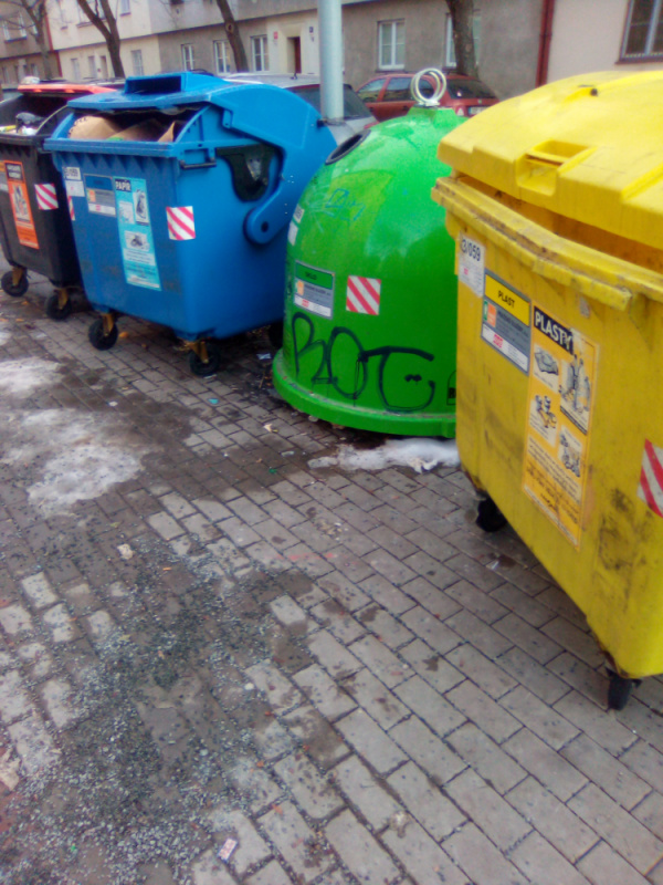Nepořádek kolem popelnic.