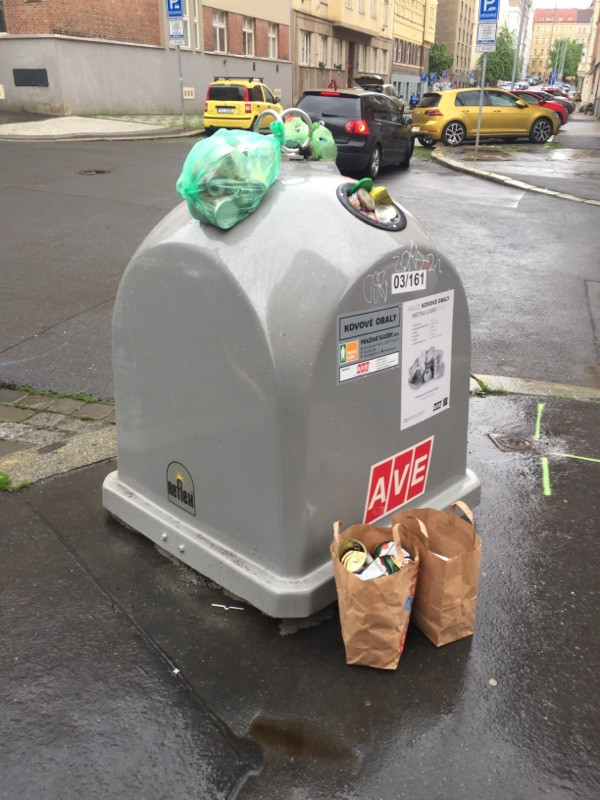 Přeplněný kontejner na "plechovky" uz nekolik dnu.