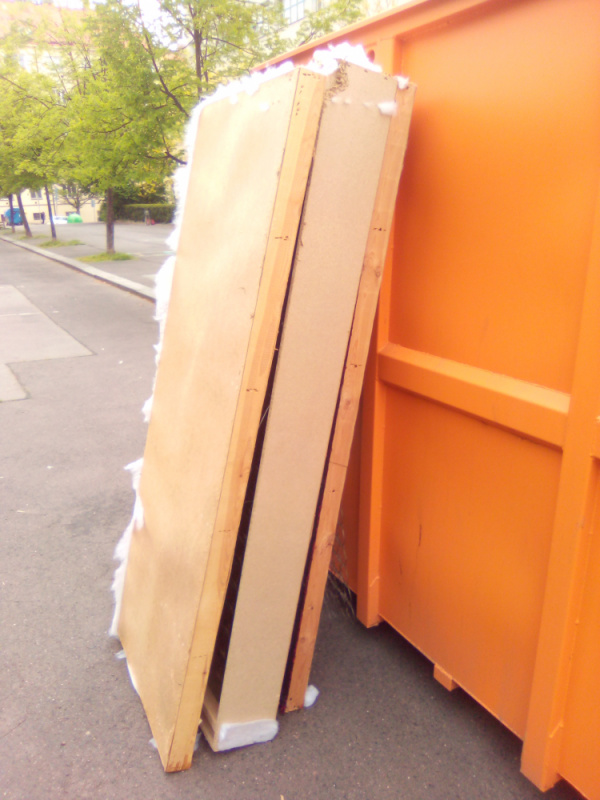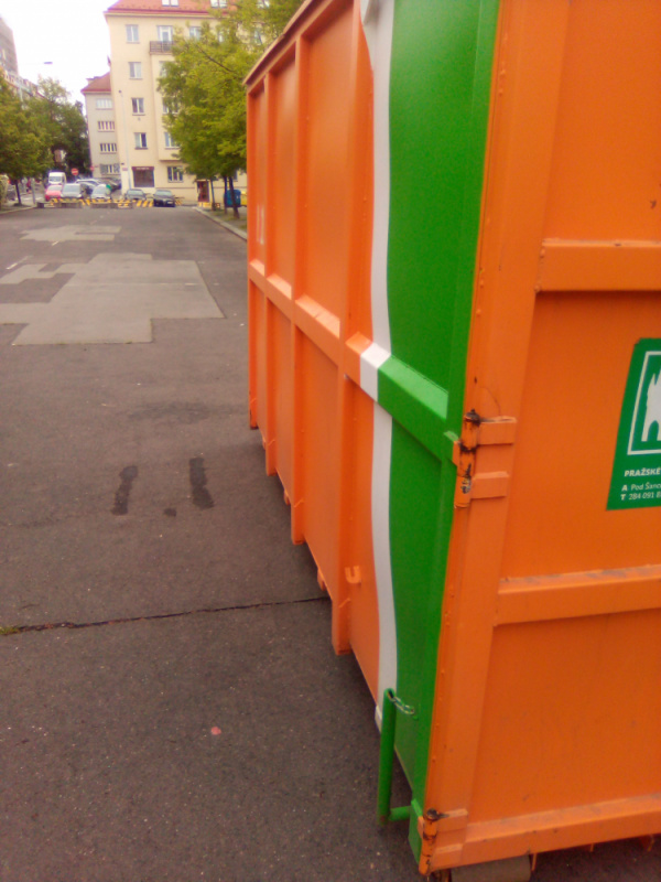 gauč opřený o kontejner na papír před ZŠ Lobkovicovo - volali že školy