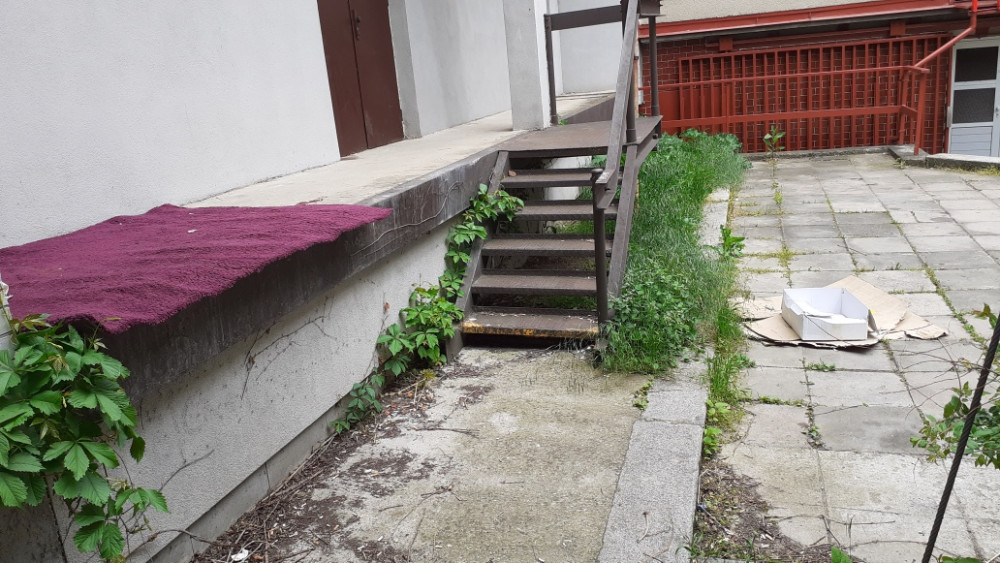 koberec a krabice za elektrorozvodnou u vjezdu do garáží z Lupacovi ulice