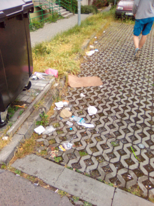 Koněvova 109, chronický nepořádek kolem popelnice