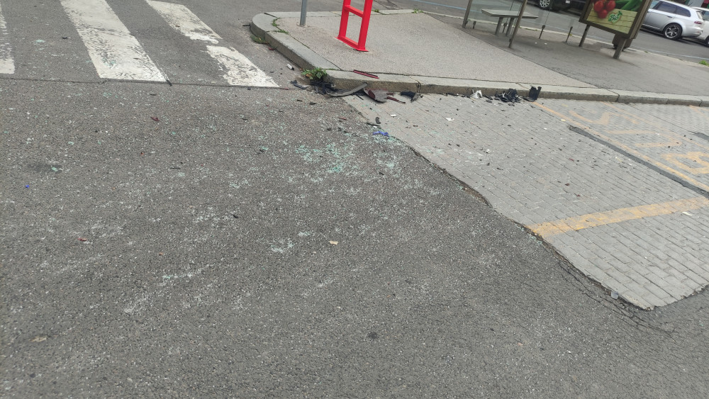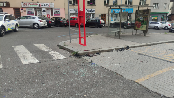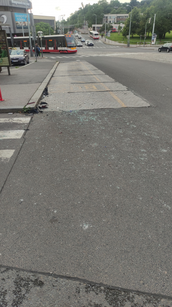 Střepy asi po dopravní nehodě v prostoru zastávky MHD Olšanské náměstí