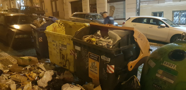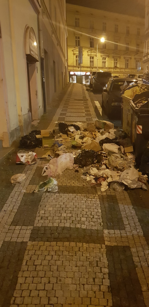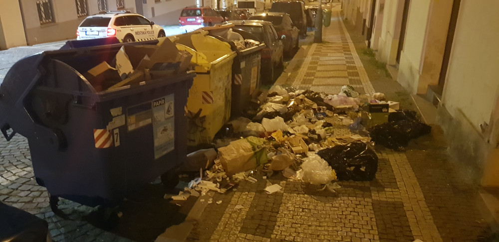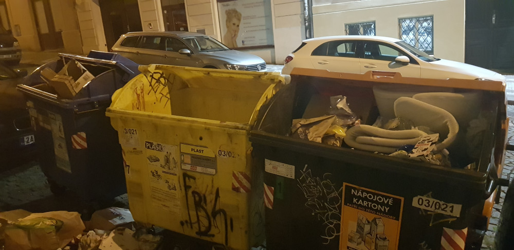 Cimburkova ulice 4, vyházený kontejner na plasty na chodníku a nádoby na odpad umístěný v parkovací ploše pro osobní automobily