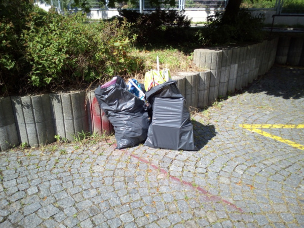 Dva igelitové pytle s odpadky u garáží.