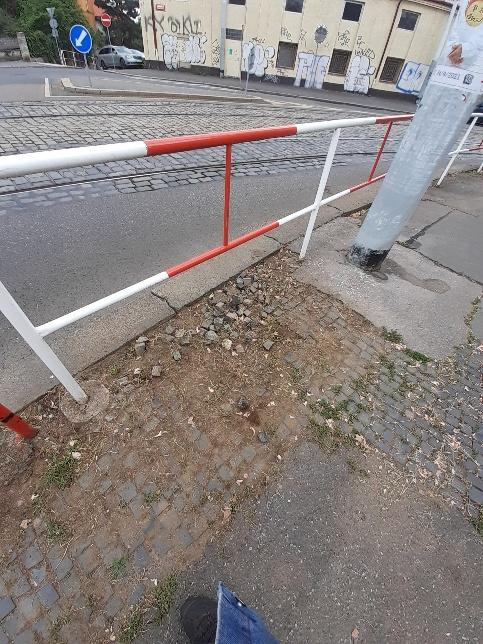 Poškozená kostková mozaika u zábradlí na křižovatce...