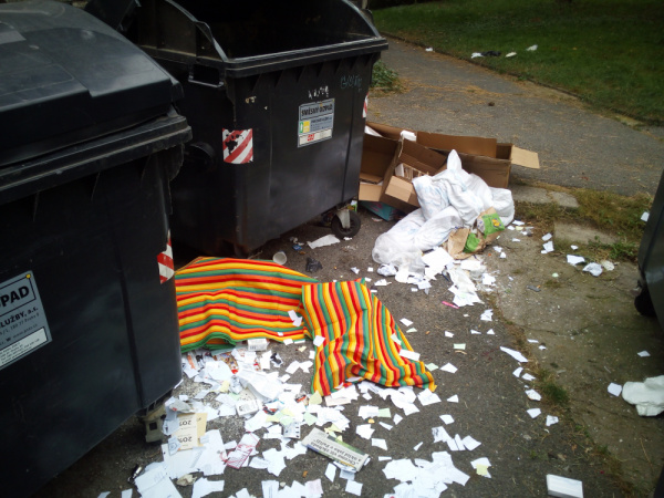 Textil, kartonové krabice, roztrhaný papír. Ulice Křivá napr.č.o.7,Praha 3.