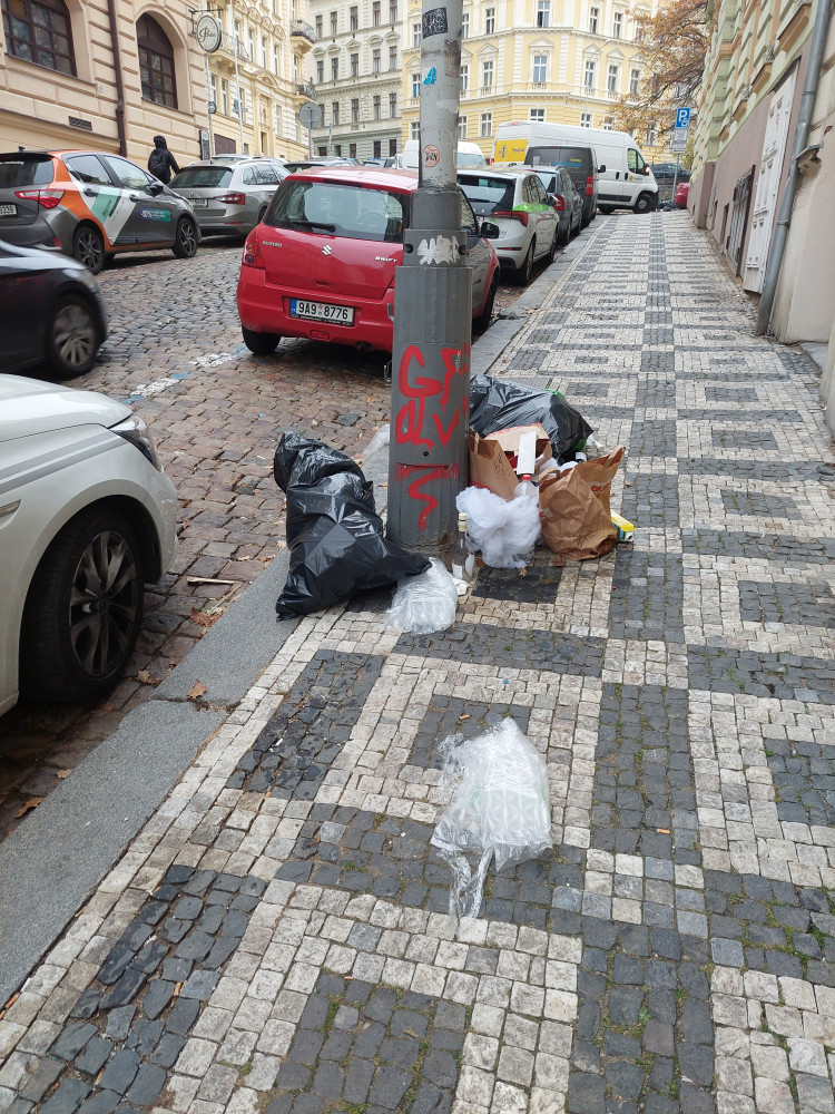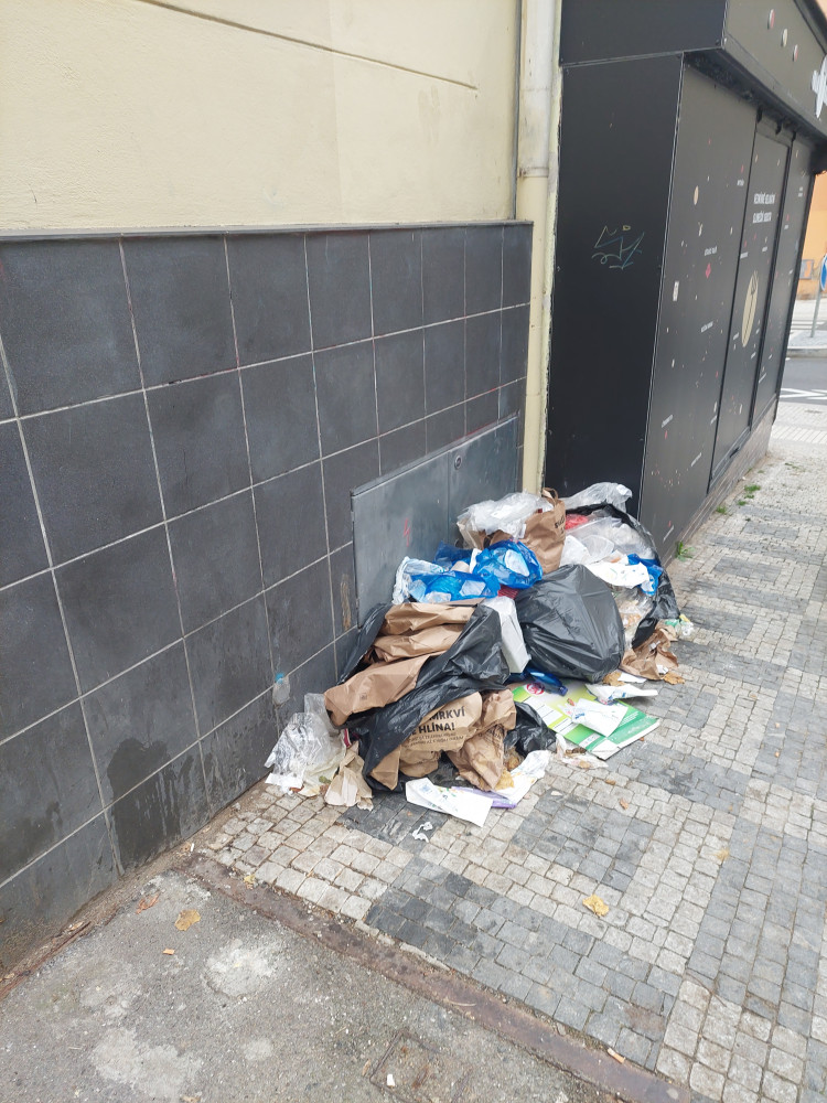 Vysypané odpadky v důsledku odstranění popelnic. Černá skládka na dvou místech - Jeronýmova 7 a Jeronýmova 3 resp. 5