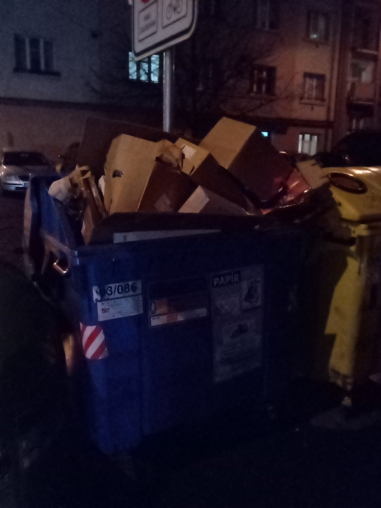 přeplněný kontejner na papír