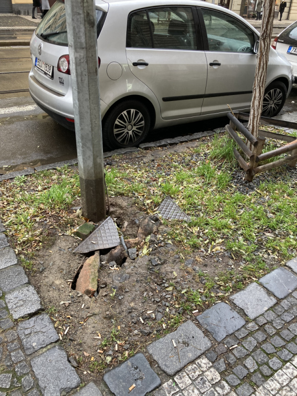 Propadlý a rozbitý poklop umístěný v hrabátku kolem stromu.