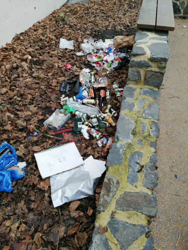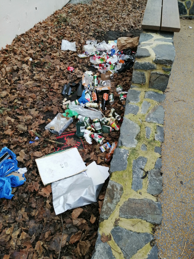 Za místem s trampolínami na cyklostezce u tachovskeho náměstí v sypané odpadky, plechovky, lahve