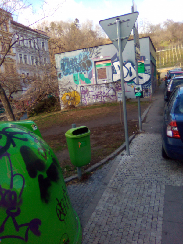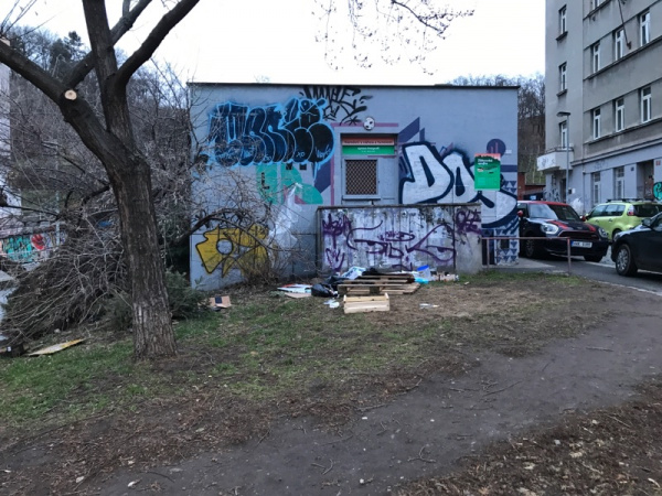 V prostoru před bývalými toaletami někdo vyhrabal popelnici.