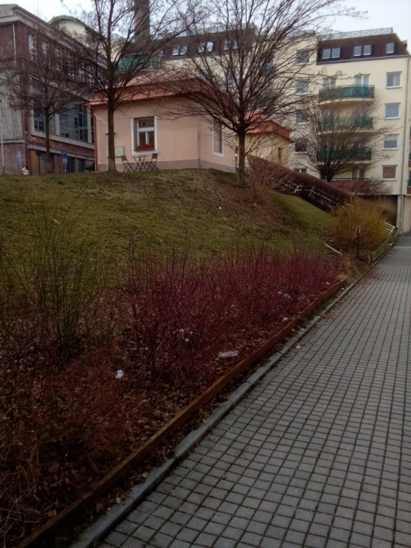 Odpadky v záhonech a keřích vedle chodníku, jsou tu již několik týdnů. Nejvíce v nafoceném záhonu, ale i v okolí cca 100 m v této ulici.