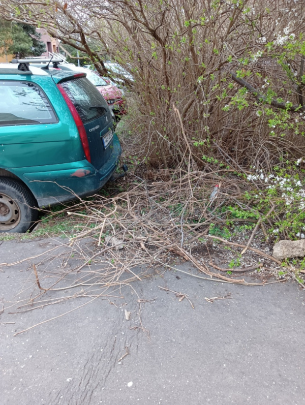 polámané větve a kusy betonu. Slepý konec ulice Na Jarově