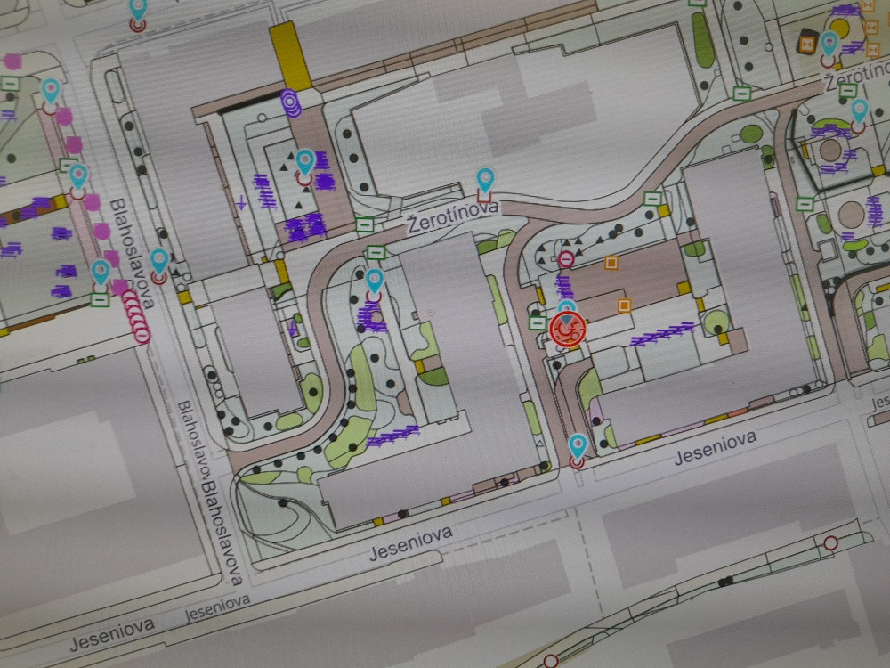 nepořádek u koše ve vnitrobloku Jeseniova X Rohacova - na mapce na fotce je to červený bod